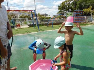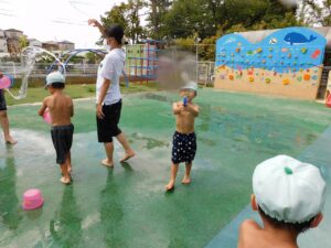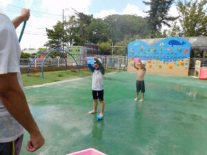 保育部さん、幼稚部さん一緒に水遊びを行い友達と水を掛け合ったりし楽しんでいました