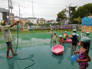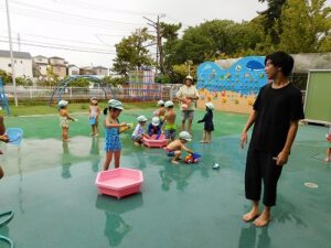 先生やお友達とお水の掛け合いや水遊び用の玩具で遊びました。