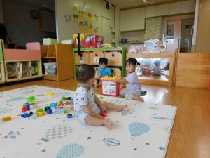 水遊びの後、保育部のお友達はブロックで遊び、ニコニコ笑顔が沢山見られました。