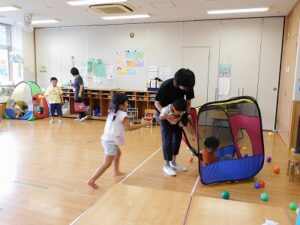 お給食の後は、幼稚部のお友達がボールプールで、面白そうなゲームをしていました。