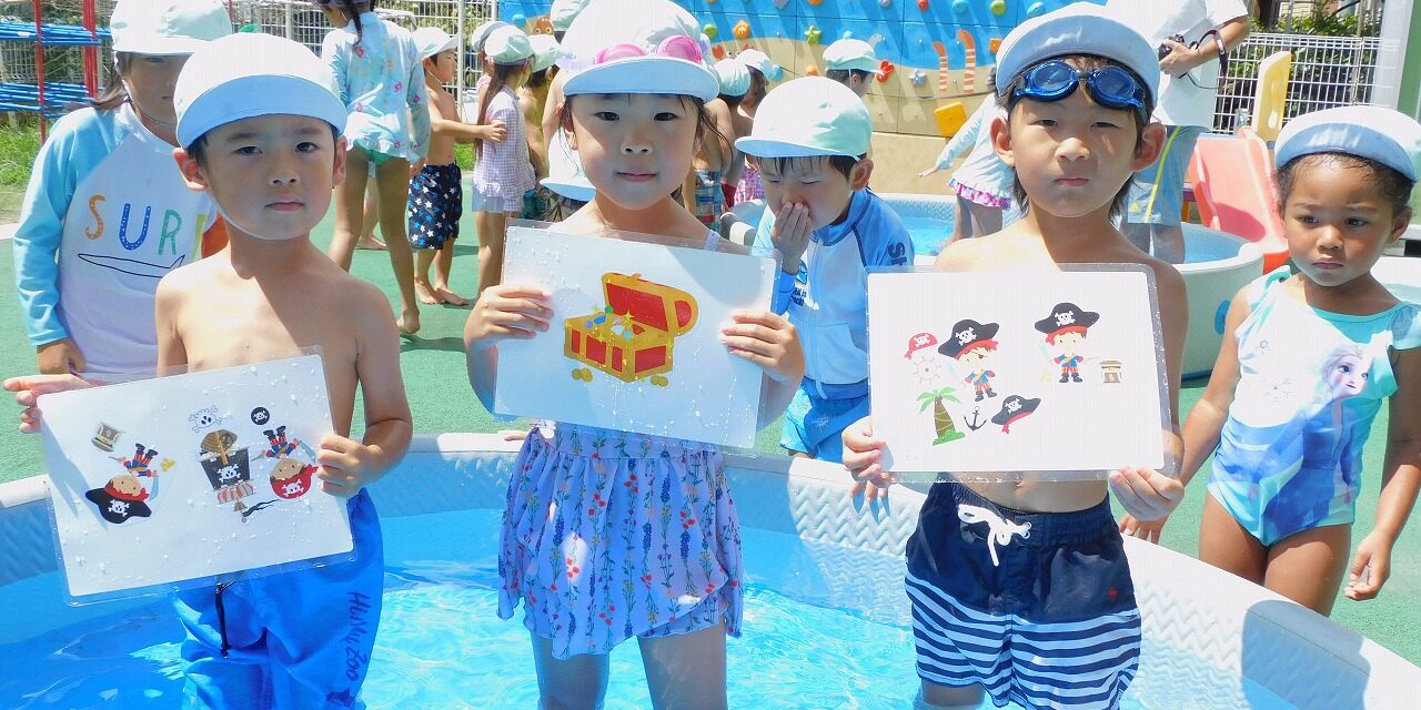 ラッコ組、ペンギン組ではテラスで最後のプール遊びを楽しみました