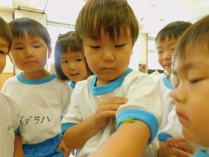 「何だろう??」とみんなで近寄ってみると、とっても元気なバッタでした。