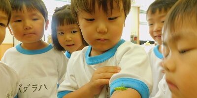 「何だろう??」とみんなで近寄ってみると、とっても元気なバッタでした。