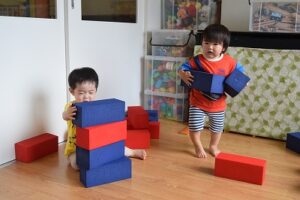 先生がブロックを上手に積み上げていると、真似をして高く積み上げて遊ぶ姿が見られました!