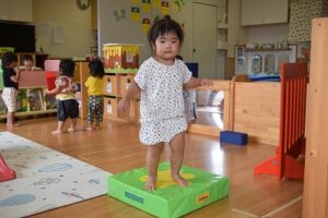 ペンギン組さんは、お部屋の中でソフトブロックや滑り台を出して遊びました(^^♪