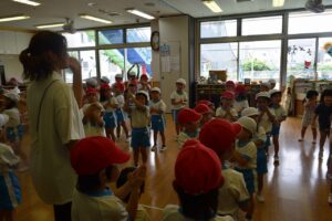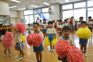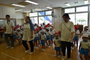 今日は、運動会のリハーサルを幼稚部の部屋で全クラスで取り組みました
