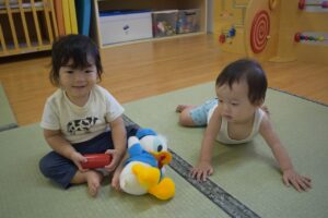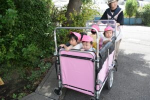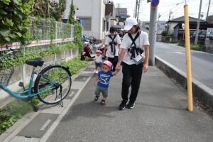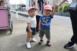 保育者と手をつないで散歩を楽しむ姿が見られていました