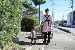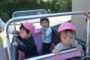 カートに乗ってお散歩しているお友達も、先生の歌声に耳を傾け