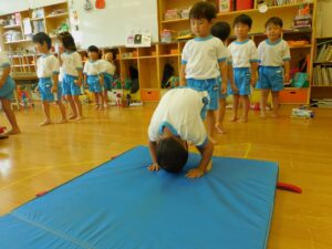 前転では順番に並び、一人ずつ行っていきました