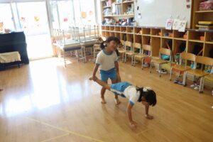 2人、2人組でジャンケンをし手押し車を順番に取り組みました