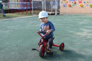 保育部のお友達は、幼稚部のお兄さんの三輪車の後ろに乗ったりお砂場遊びを楽しんでいました!