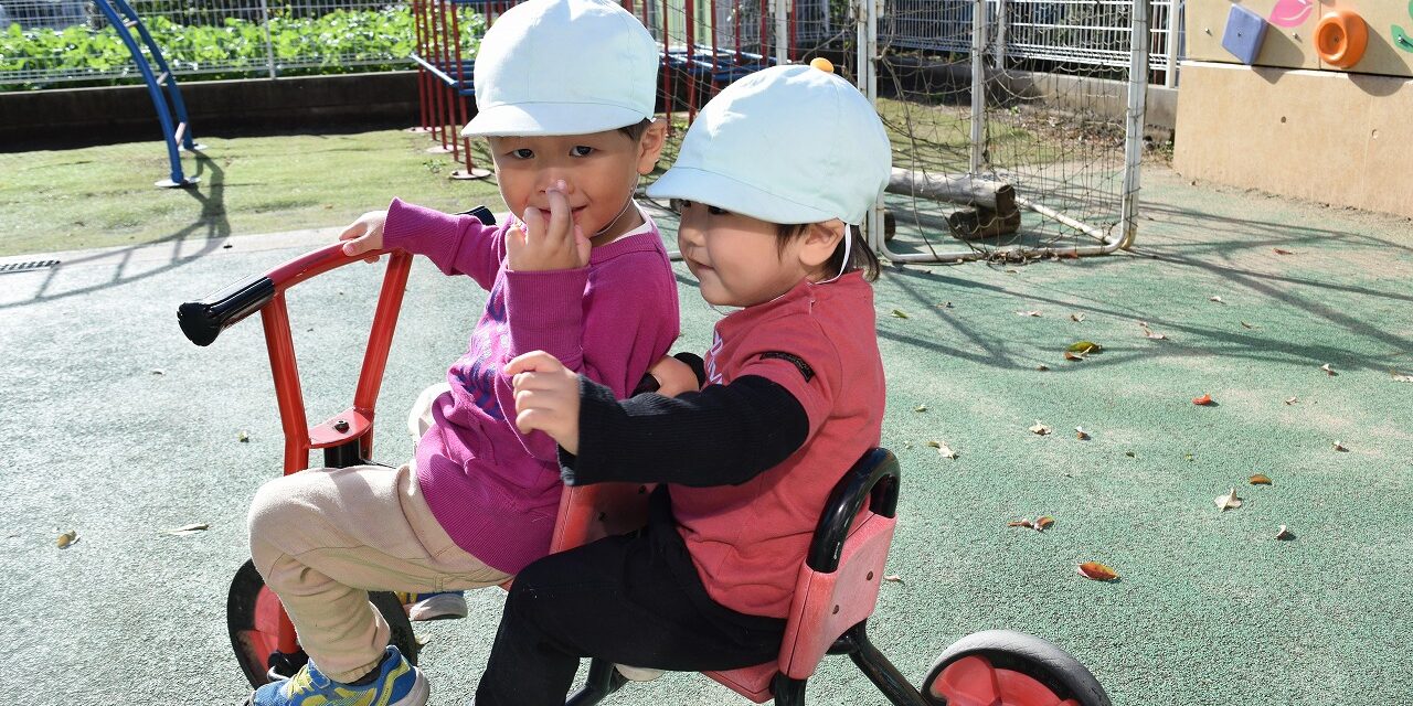 保育部のお友達は、幼稚部のお兄さんの三輪車の後ろに乗ったりお砂場遊びを楽しんでいました!