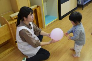 保育者から風船を「はいどうぞ」と受け取ったり