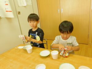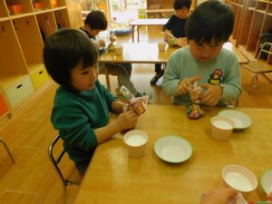 今日のおやつはクッキーで、クリスマス柄の紙に包んであり