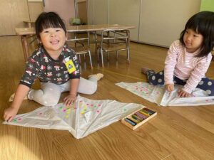 イルカ組のお友達は、みんなで凧の制作を行いました。