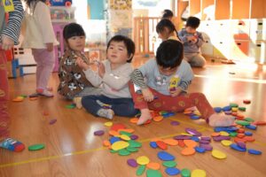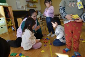 いろんな色を集めたり、先生と上に積み重ねて楽しんだりしていました