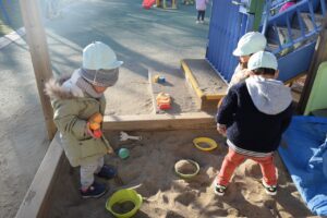 砂場や三輪車などで遊びを行い、ごっこ遊びをしている姿が見られていました