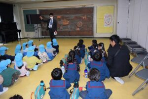 小学校の先生のお話を少し緊張した表情で聞いていました。
