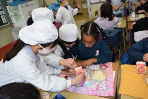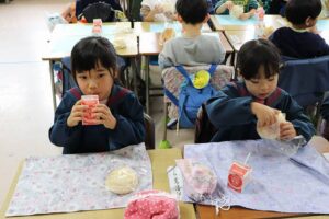 牛乳パックにストローを指すことも初めて経験する子が多く、一年生が丁寧に教えてくれました。