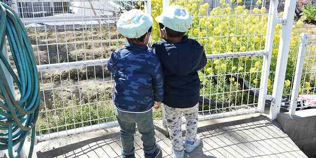 畑や園庭に咲いているお花に興味を持ったようで、お友達と一緒に眺めながら