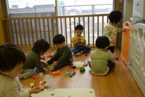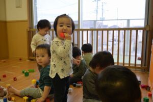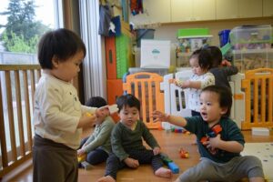 「かして」「どうぞ」のやり取りをしながら一緒に遊んだりする姿が