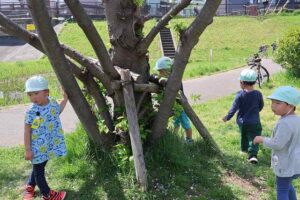 木の周りや草むらの中には虫たちがいたようで、みんなで協力しながら探しています。🐞