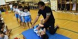 今日は前転の練習を行いました。「回る時はおへそを見るよ。ダンゴムシのポーズ」