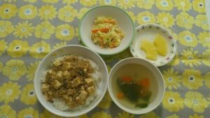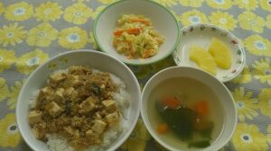 ~今日のお給食~ ・マーボー豆腐丼 ・鶏ささみのカレー風味サラダ ・春雨スープ ・パイン ~今日のおやつ~ ・スイートポテトトースト ・牛乳 Share this post Share on FacebookShare on Facebook Share on XShare on X Post navigationPreviousPrevious post:10月21日(月)NextNext post:10月22日(火)関連記事12月15日2025年12月15日12月9日2025年12月9日12月5日2025年12月5日12月4日2025年12月4日11月28日2025年11月28日11月27日2025年11月27日
