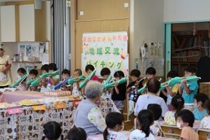 ライオン組のお友達が代表で、「かえるの歌」のピアニカ演奏と「七夕」のお歌を披露しました。