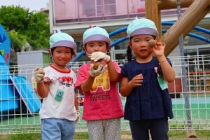 3歳児クラスのお友達は、手で掘ったりシャベルを使って