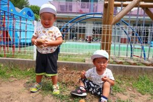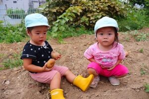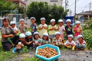 0歳児クラスのお友達も先生と一緒に畑へ行き、土やじゃがいもに