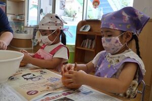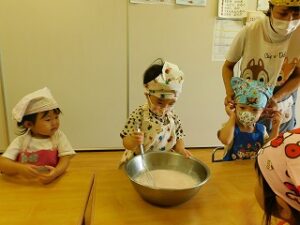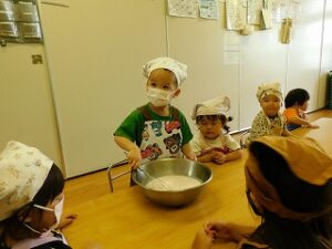 2歳児クラスは、フルーチェのもとを入れて、牛乳を入れてまぜまぜして、