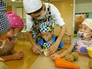 昨日、園の前にある畑で掘ったジャガイモを使ってカレー作りを楽しみました。