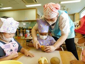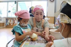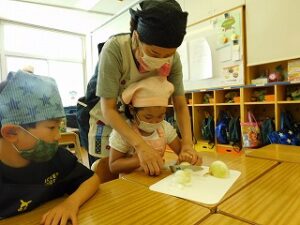 3歳児は、玉ねぎの皮をむいて野菜を洗ったり、