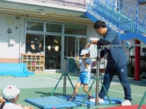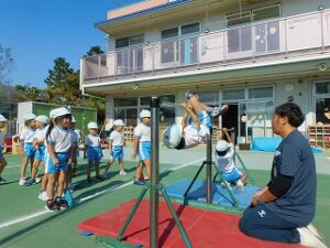 鉄棒で「ぶたさん」や「こうもり」、「まえまわり」を
