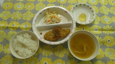 ~今日のお給食~ ・いわしの磯辺フライ ・鶏ささみのカレー風味サラダ ・ごはん ・味噌汁(もやし、油揚げ、しめじ) ・ミニゼリー         ~今日のおやつ~ ・牛乳 ・フロラ…