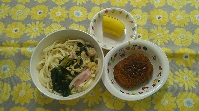 ~今日のお給食~ ・冷やしうどん ・コロッケ ・バナナ         ~今日のおやつ~ ・牛乳 ・たぬきおにぎり