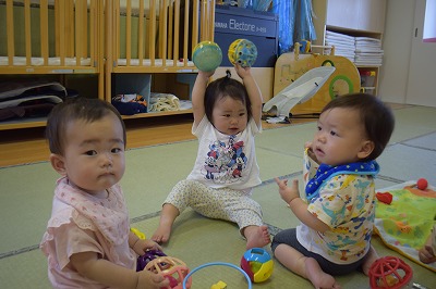 今日ラッコ組のお友達は テラスで水遊びをしたり お部屋で音が鳴るおもちゃやボールで遊びました♪           シャカシャカ音を鳴らして お友達と顔を見合わせて笑って…
