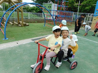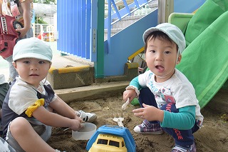 今日のイルカ組は、園周りに散歩に出かけ、戻ってきてから園庭で遊びました。 砂場で遊んだり、「よーいドン!」とお友達や先生と追いかけっこをしたりしました。 楽しかった…