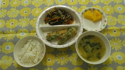 ~今日のお給食~ ・ちくわの磯辺揚げ ・ひじきの炒め煮 ・ごはん ・味噌汁(ほうれんそう・豆腐・油揚げ) ・モモ ~今日のおやつ~ ・牛乳 ・お誕生日ケーキ &nb…