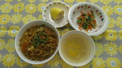 ~今日のお給食~ ・焼きそば ・小松菜サラダ ・中華スープ(えのきたけ・コーン・はるさめ) ・バナナ ~今日のおやつ~ ・牛乳 ・おかかおにぎり &n…