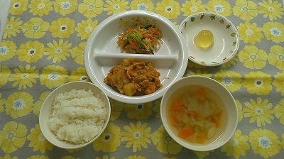 ~今日のお給食~ ・ポークビーンズ ・もやしのナムル ・ごはん ・コンソメスープ(にんじん・えのきたけ・キャベツ) ・ミニゼリー ~今日のおやつ~ ・牛乳 ・バウム…