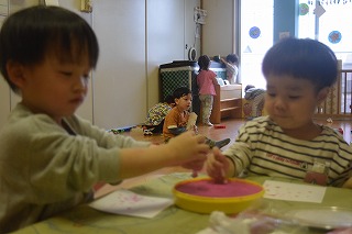 今日のイルカ組は、個別に制作活動をしました。 スタンプ台に綿棒をトントンして、画用紙に模様をつけて楽しみました。 何ができあがるかは、お楽しみに!! あとは、お部屋…