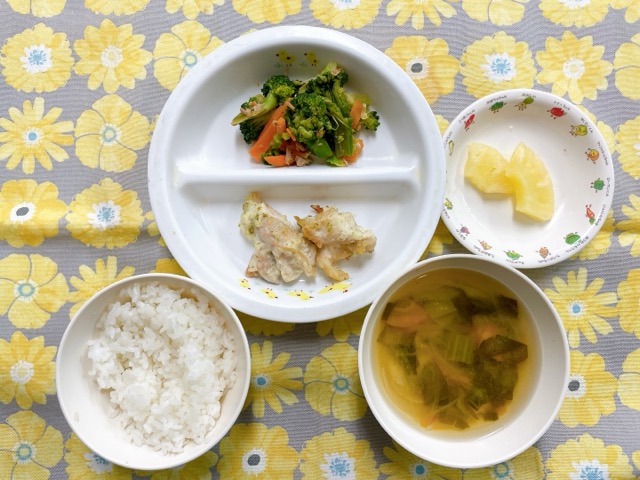 ~今日のお給食~ ・鶏肉の青のりやき ・ブロッコリーのツナサラダ ・ごはん ・味噌汁(たまねぎ・こまつな・にんじん) ・パイン ~今日のおやつ~ ・牛…