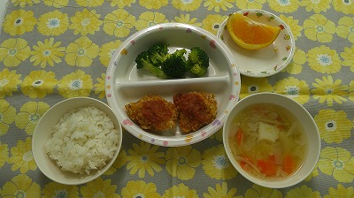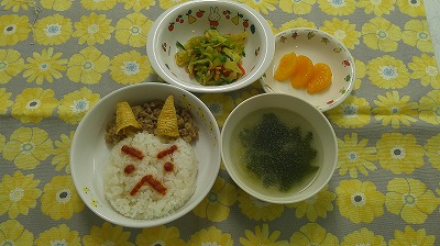 ~今日のお給食~ ・鬼そぼろご飯 ・キャベツのおかか和え ・中華スープ ・みかん ~今日のおやつ~ ・牛乳 ・金棒アメリカンドッグ