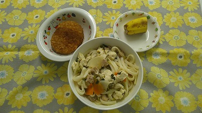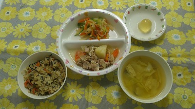 ~今日のお給食~ ・肉じゃが ・大根サラダ ・ひじきごはん ・味噌汁(油揚げ・しめじ・キャベツ) ・ミニゼリー ~今日のおやつ~ ・牛乳 ・バナナきな粉  …
