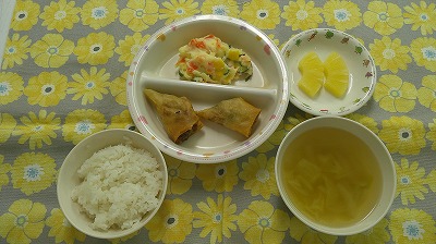 ~今日のお給食~ ・春巻き ・ポテトサラダ ・ごはん ・コンソメスープ(たまねぎ・キャベツ・コーン) ・パイン ~今日のおやつ~ ・牛乳 ・メロンパンクッキー &n…