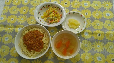 ~今日のお給食~ ・ミートスパゲティ ・マカロニサラダ ・コンソメスープ ・パイン         ~今日のおやつ~ ・たぬきおにぎり ・牛乳