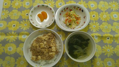 ~今日のお給食~ ・マーボー豆腐丼 ・鶏ささみのカレー風味サラダ ・わかめスープ ・みかん       ~今日のおやつ~ ・うどん ・牛乳