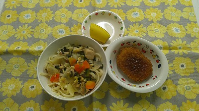 ~今日のお給食~ ・けんちんうどん ・コロッケ ・バナナ         ~今日のおやつ~ ・牛乳 ・鮭わかめおにぎり
